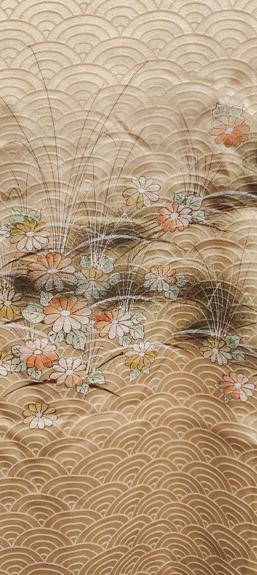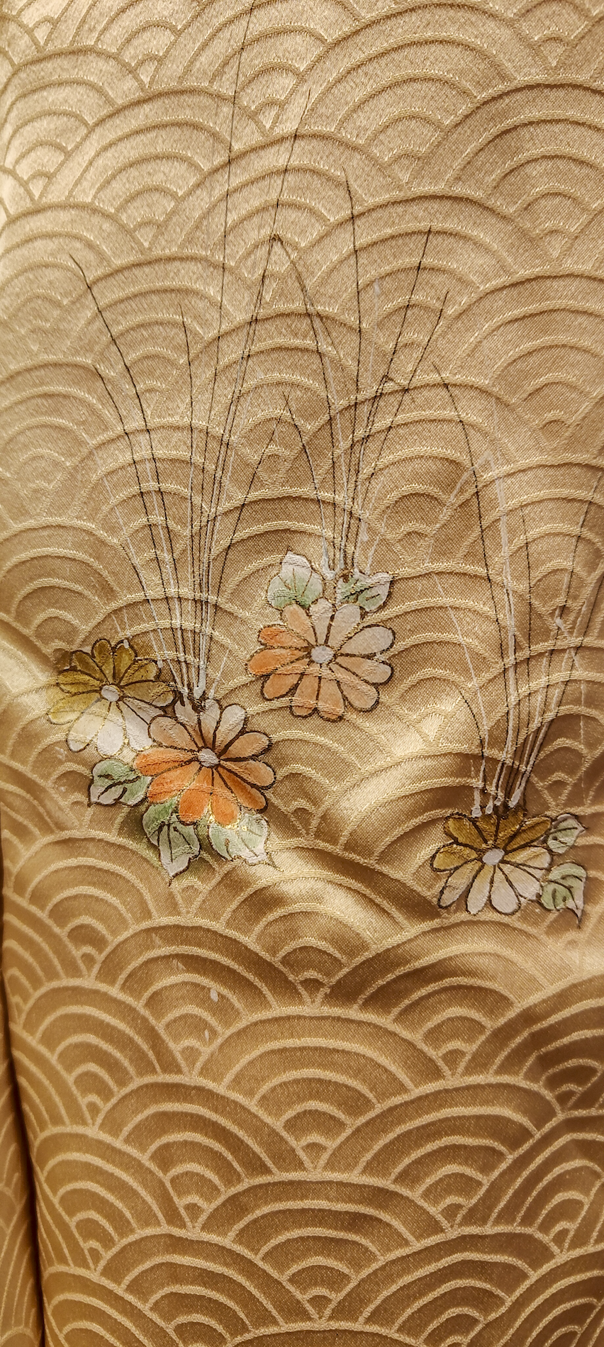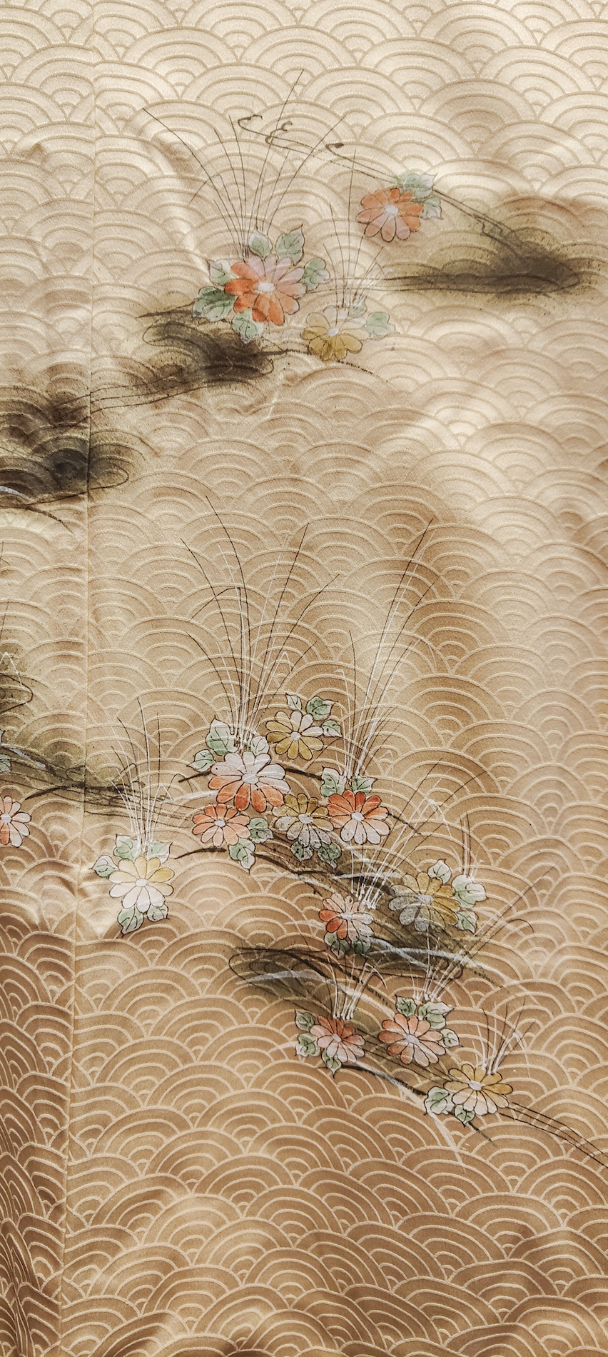 Color: Beige dorado con estampado tradicional japonés "seigaiha" y motivos florales.