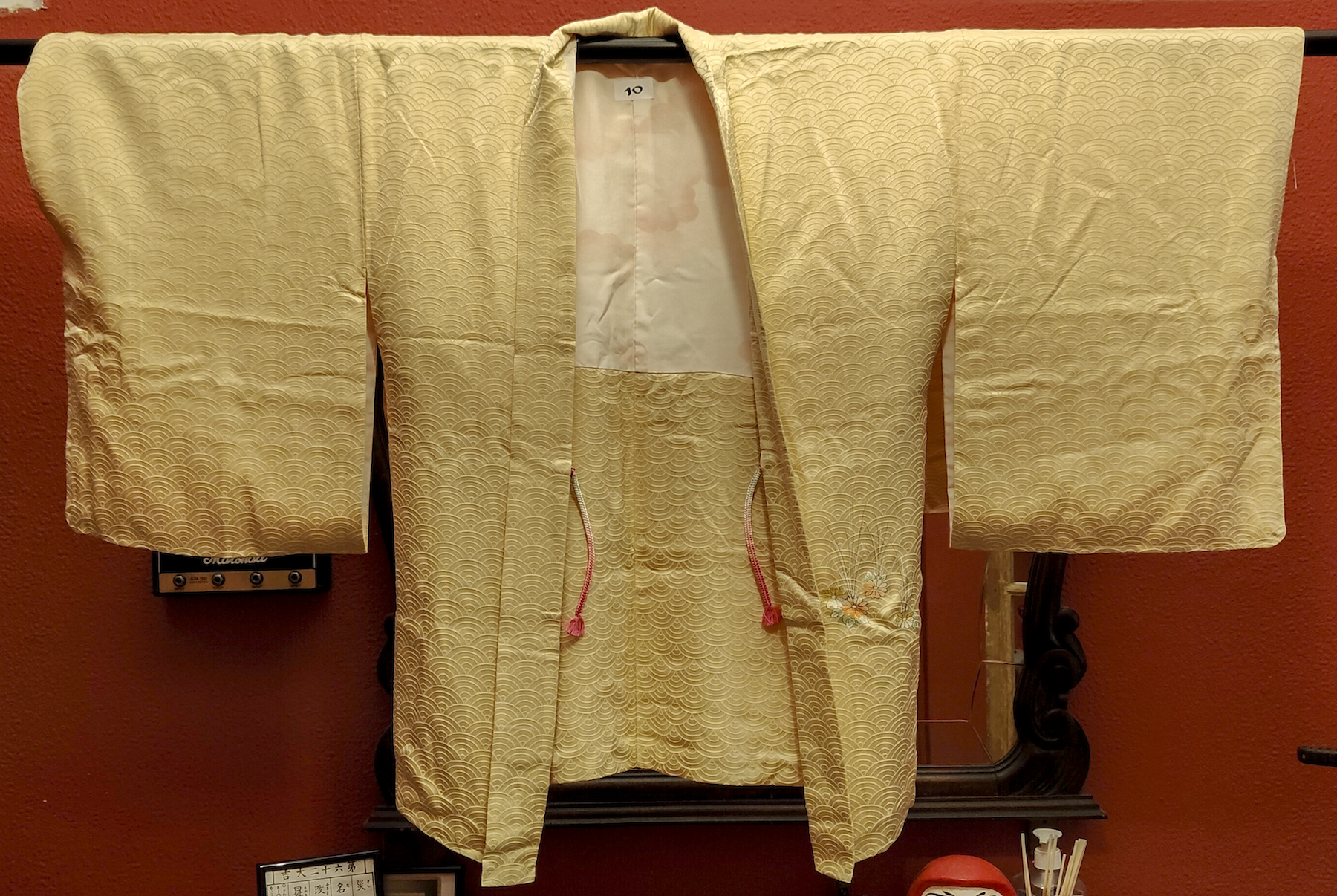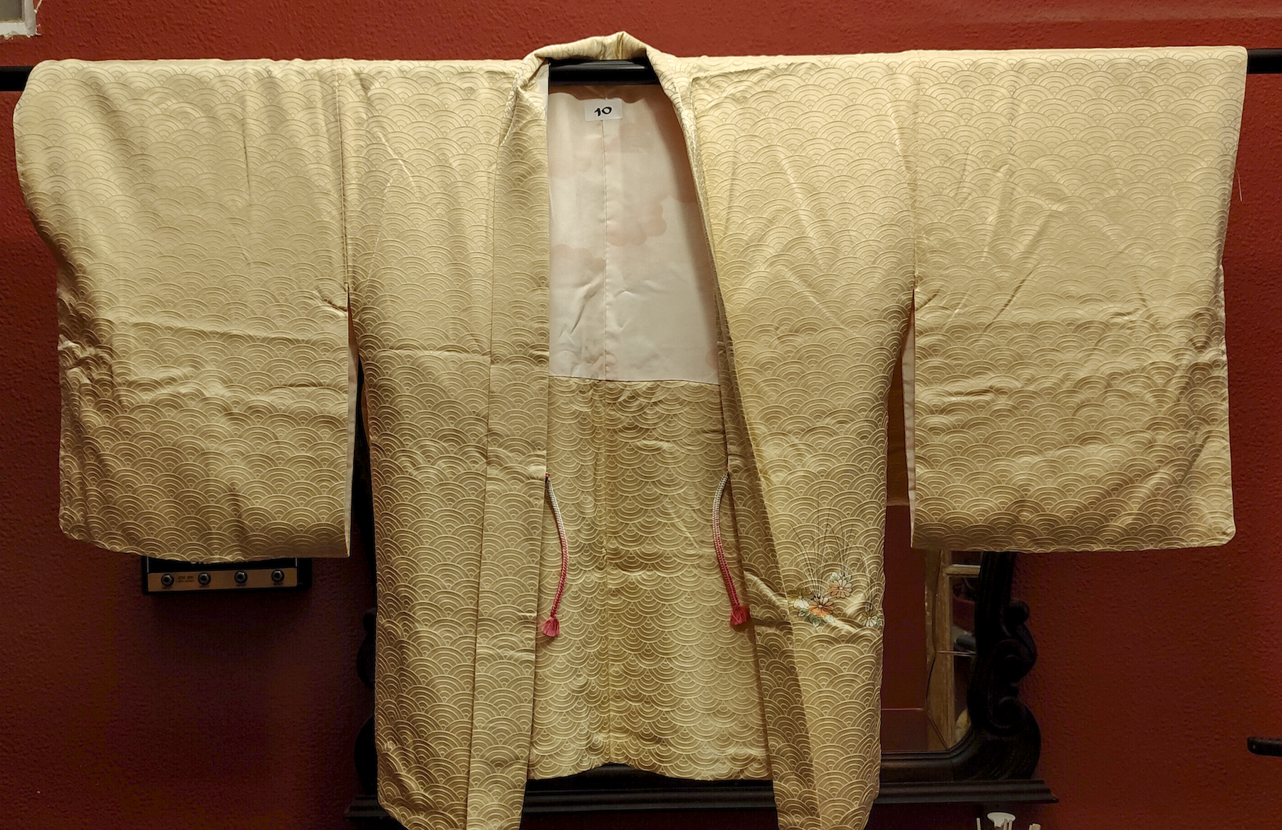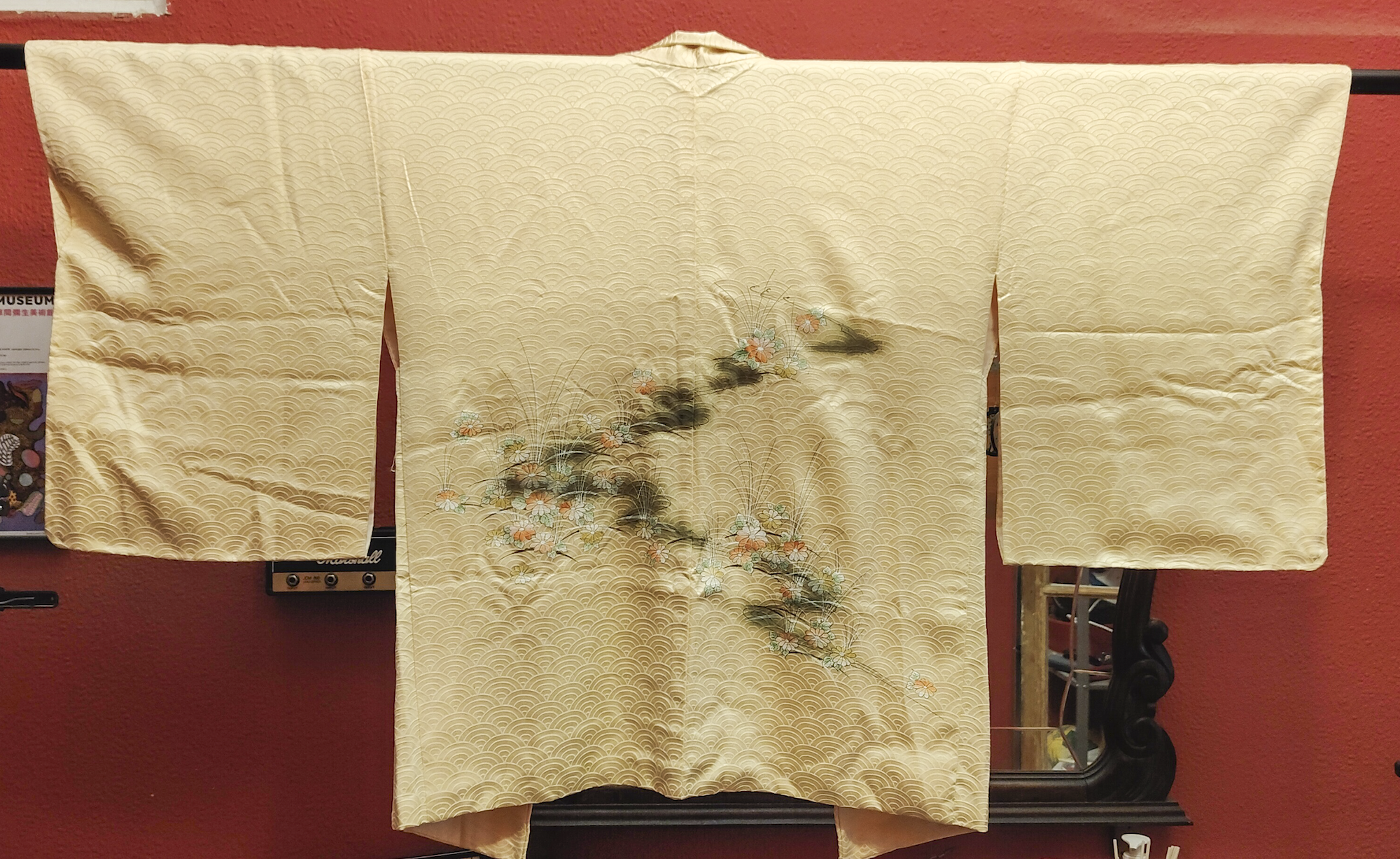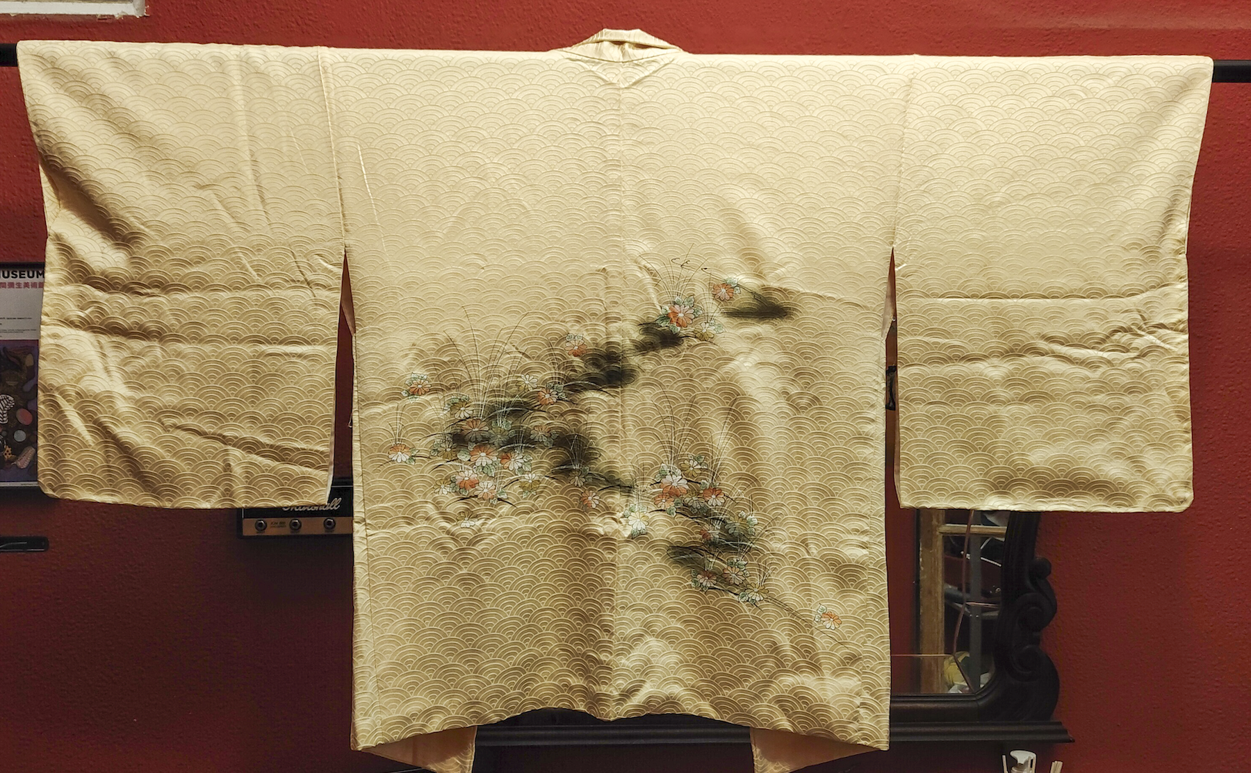 Color: Beige dorado con estampado tradicional japonés "seigaiha" y motivos florales.