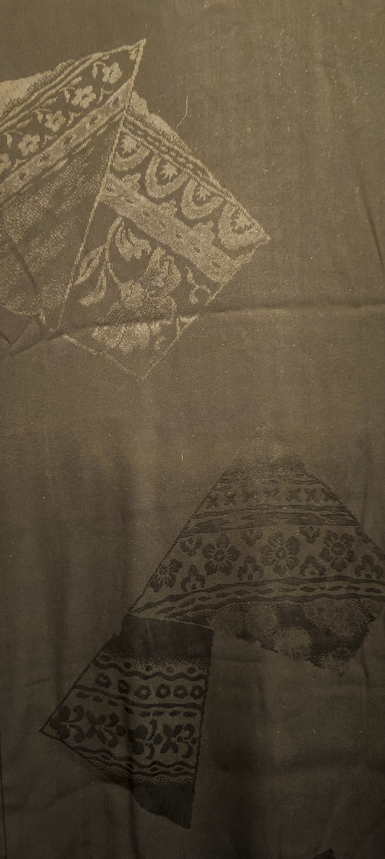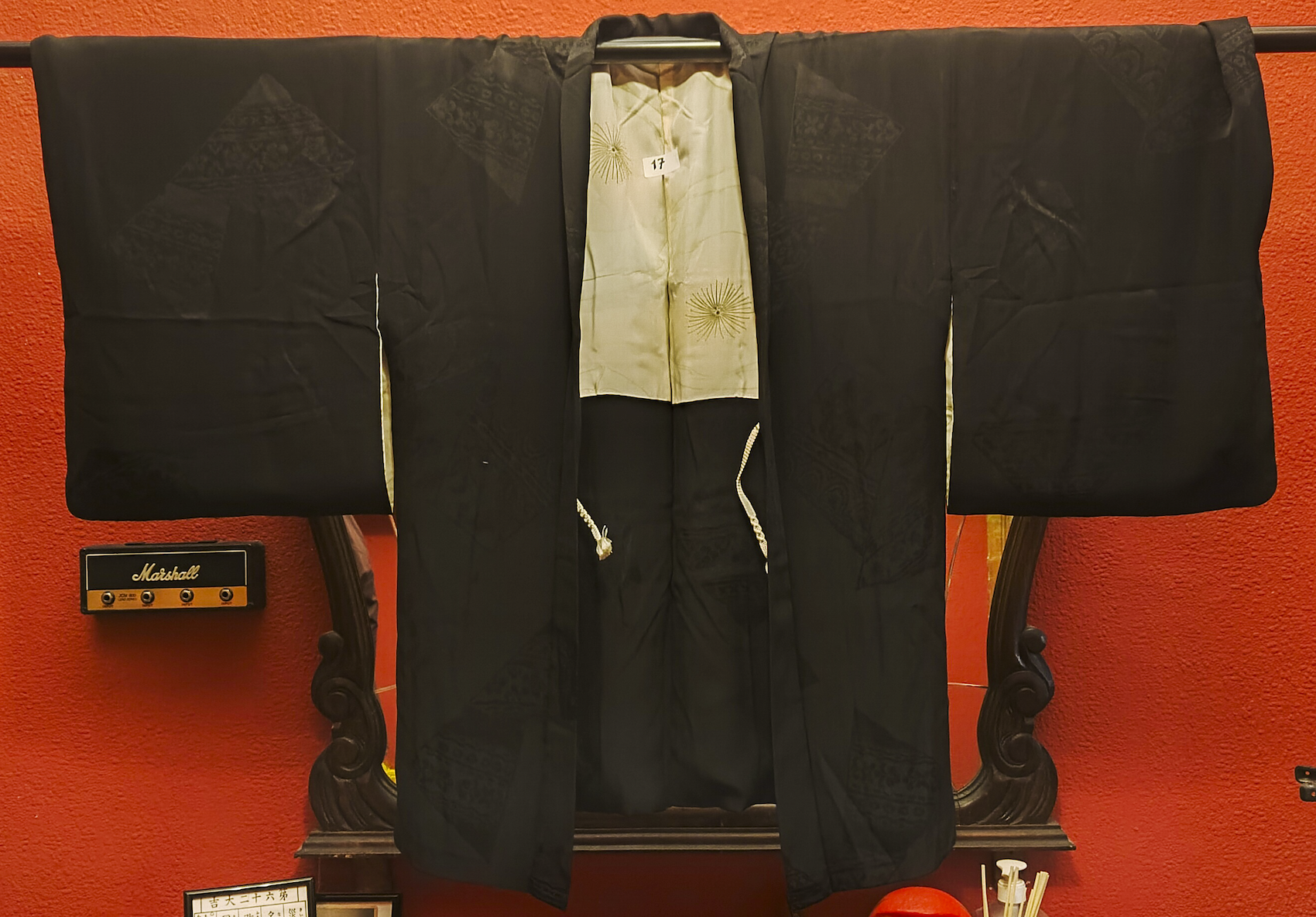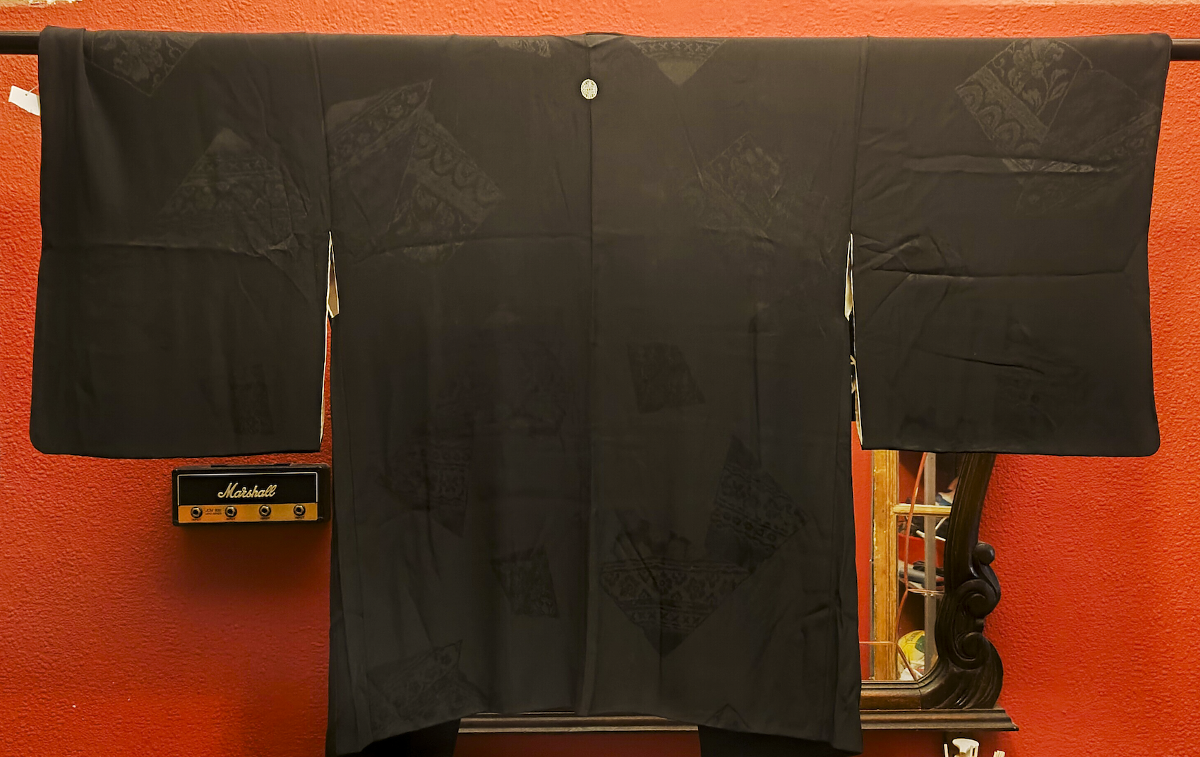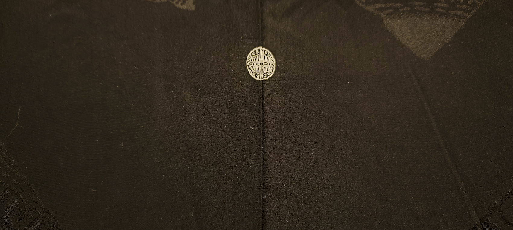 Color: Negro con estampado japonés tonal (motivo tradicional en negro sobre negro) y pequeño emblema blanco.